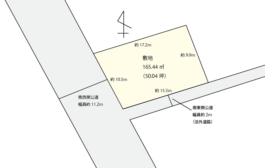 接道幅員2|南東側公道幅員約2m間口約15.3m(法外道路)